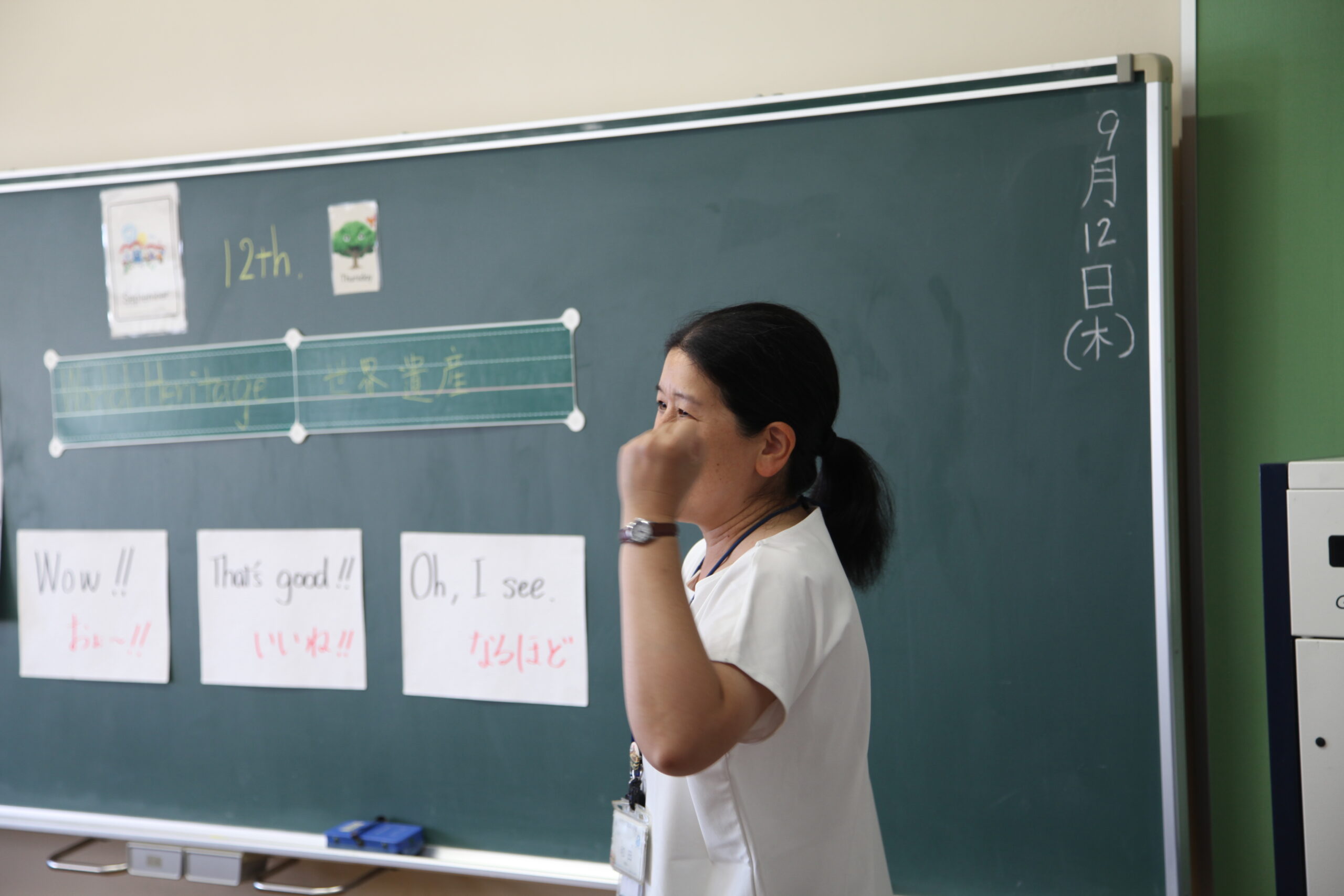 授業を見学させていただきまして、ありがとうございました。和田先生の授業はテンポが良く、子どもたちに隙を与えない感じで、ひたすら英語漬けにさせているなと思いました。「全編英語だから何を言っているか分からない」ということはなく、本当に楽しい45分間で、あんな風に授業をしたいなと思いました。