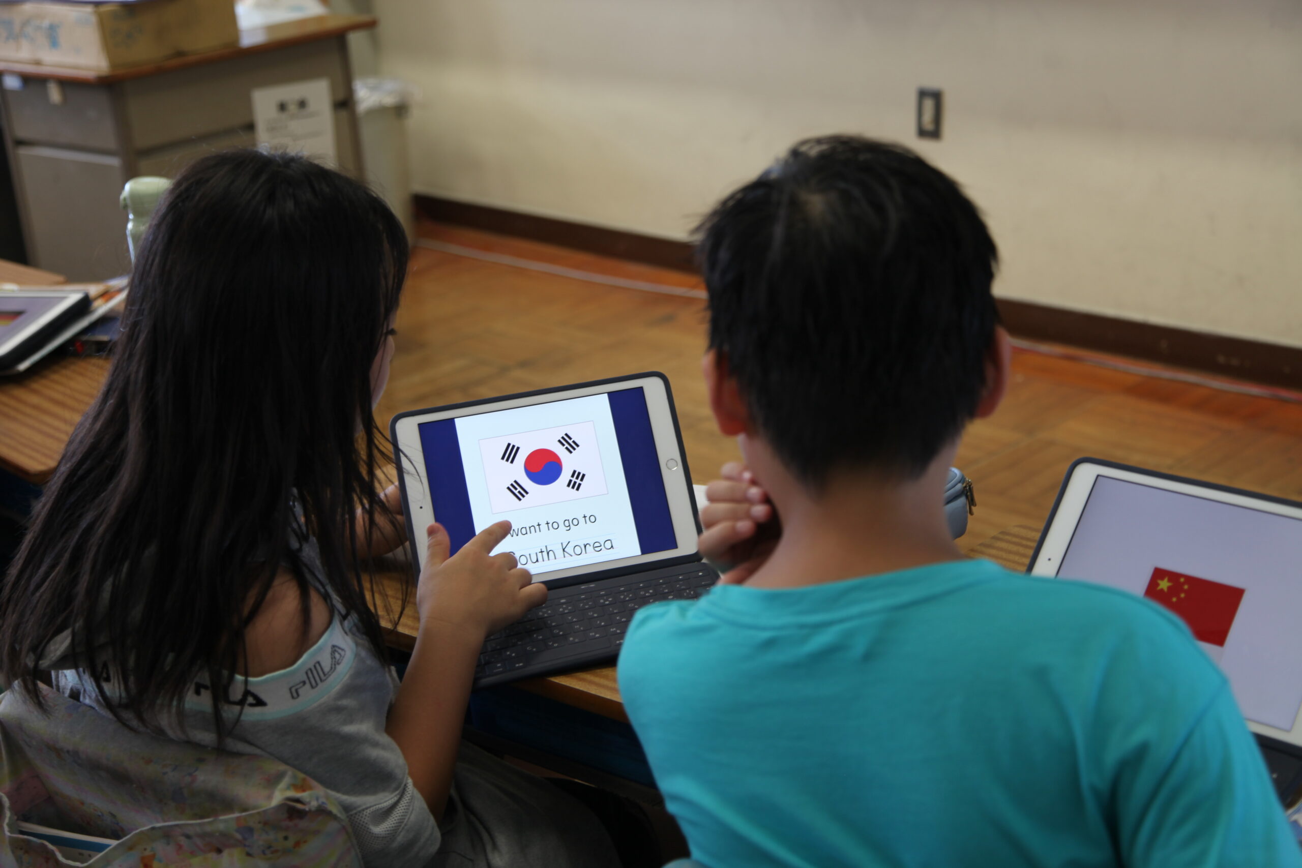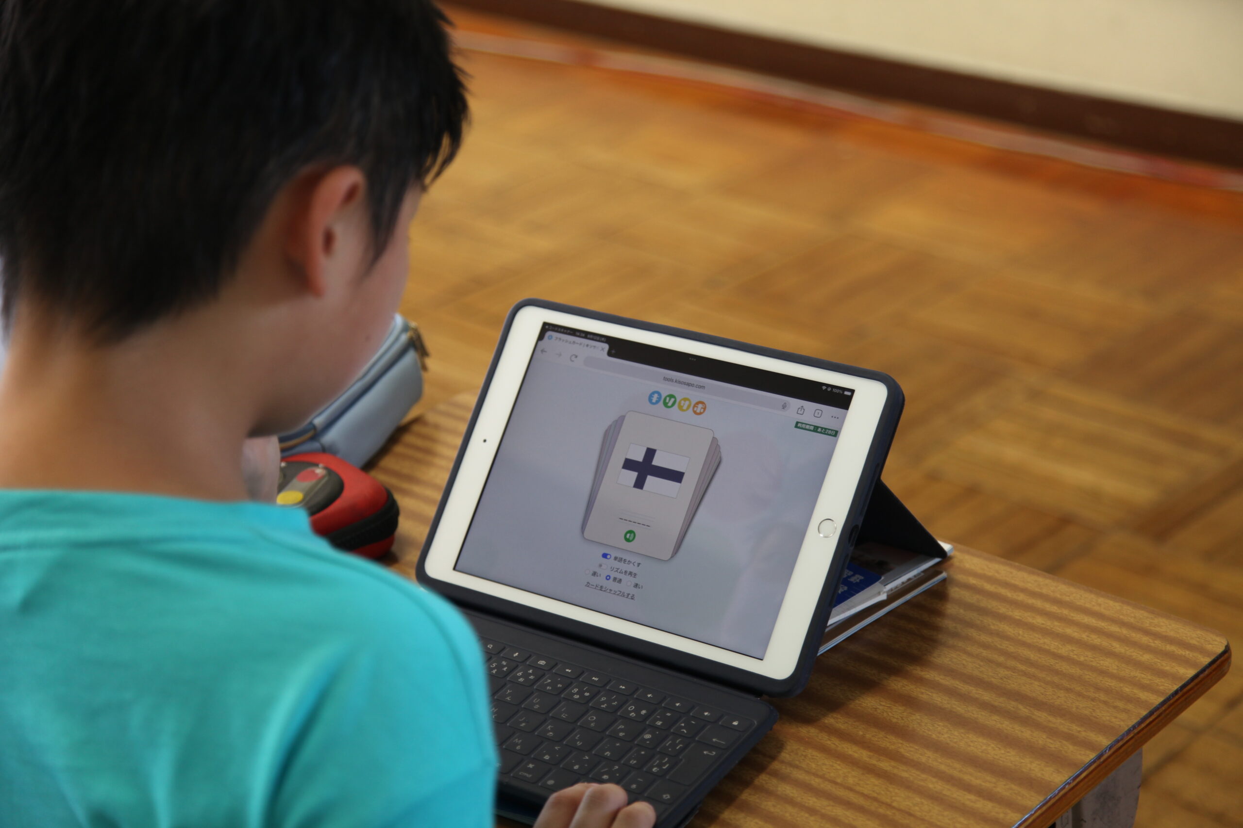 キソサポを利用するようになって、単語の導入が大きく変わったと感じています。キソサポを利用するまでは単語のピクチャーカードを作って、黒板に貼り、ALTに読んでもらってみんなでリピートして…という感じで、一斉にやっていました。でもそれだと発音が分からなくて「言わなくてもいいや」という児童が出てきてしまいます。キソサポの絵カードの場合、児童自身の端末で分からない単語の発音を何回でも聞くことができるので、授業では個別に発音を確認する時間をしっかりと取るようにしています。今では文字を隠した状態で、国名を言える子もいます。